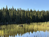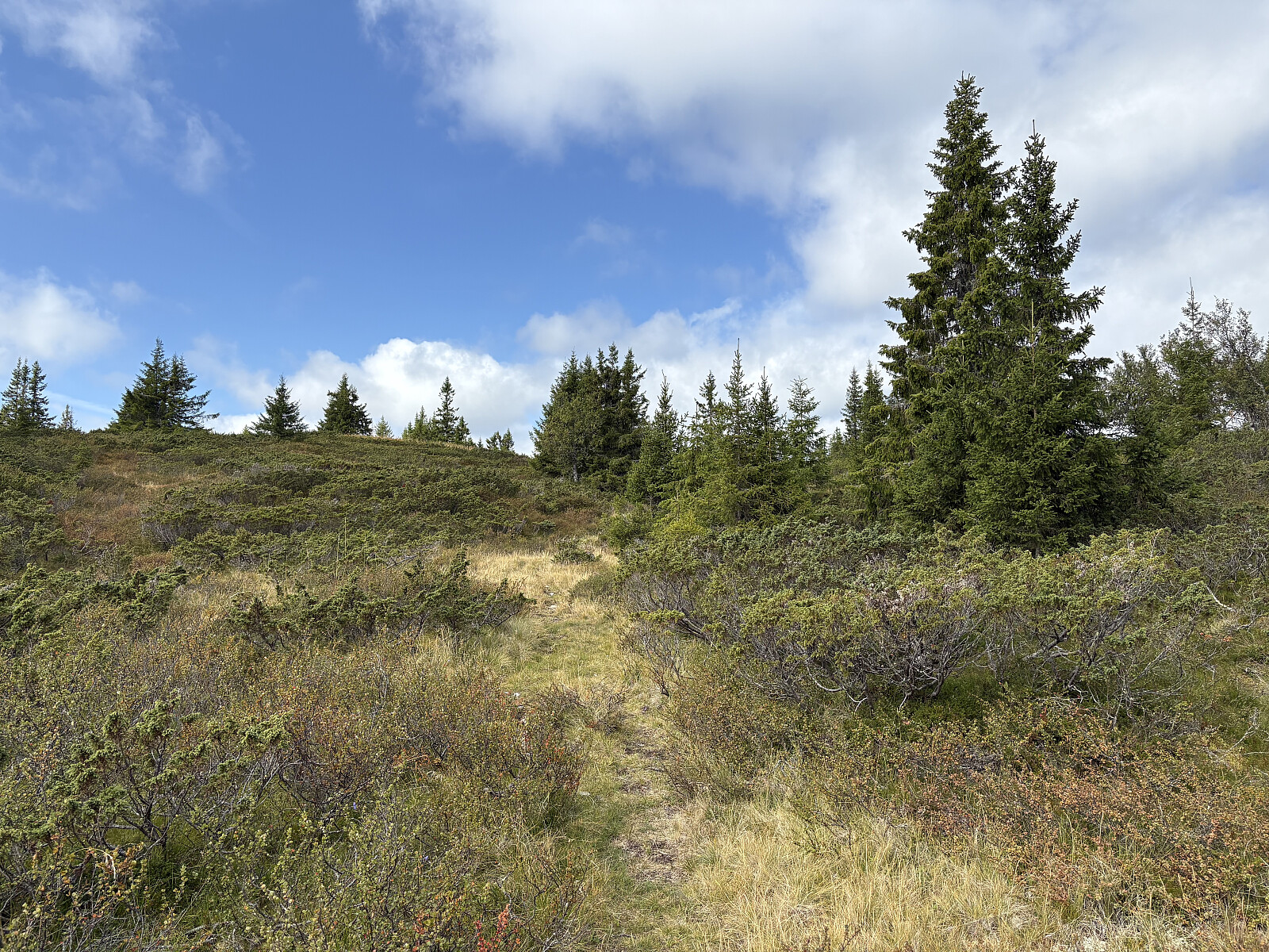 Jeg parkerte i en veilomme der hvor bomvei opp mot vestenden av Nord-Mesna går inn fra. Herfra gikk jeg litt innover veien frem til der hvor stien var avmerket på kartet. Stien var ikke lett å se i det lange sivet, men da jeg først hadde funnet den var den grei å følge innover åsryggen. Snart ble stien mer tydelig og jeg kunne følge denne til jeg var 150 meter unna toppen. Underveis fikk jeg fint utsyn ned mot Nord-Mesna enkelte steder. Det siste stykket til toppunktet ble litt bushing i tett skog, ingen utsikt fra toppen.