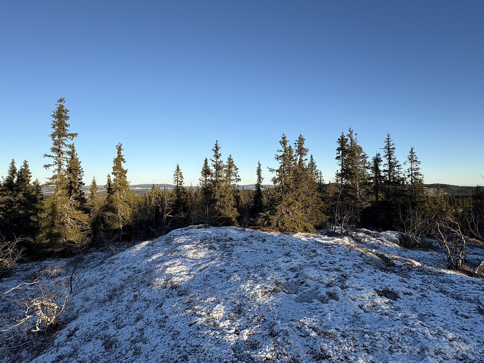 For å få til en liten rundtur gikk jeg over til Tjuvdalshøgda, før jeg stort sett fulgte høyspenttraseen tilbake til veien. Heller ikke denne toppen kunne imponere med fin utsikt, og i tillegg var den utpreget flat og uten noe naturlig toppunkt.