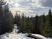 Jeg kjørte til Solem og parkerte på den store p-plassen ved lysløypa. Det var heldigvis sesongslutt slik at jeg kunne følge skiløypa innover. Omtrent 500 meter sør for utgangspunktet så jeg en svak sti som tok av fra skiløypa oppover lia. Denne kunne følges ganske langt opp mot toppen før den etter hvert ble borte. Da var det uansett ikke langt igjen til toppen som var temmelig gjengrodd og uinteressant. Jeg gikk også bortom kollen hvor trigpunktmerket er merket av på kartet. Denne var noe mer åpen men uten utsikt og uten spor etter boltene. Samme rute tilbake.