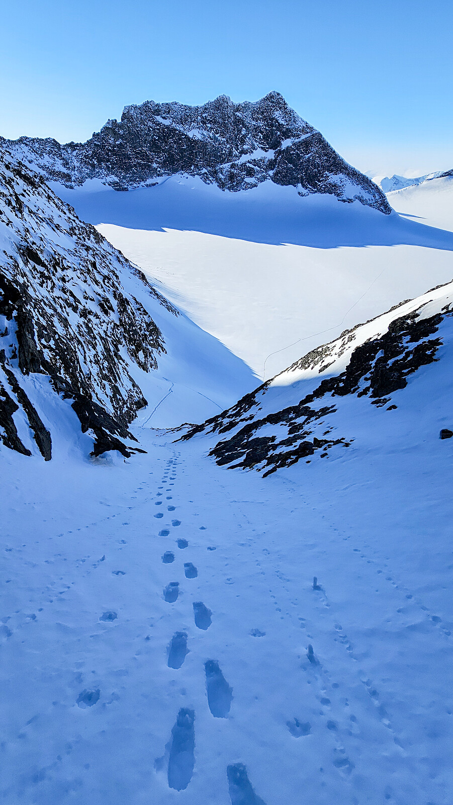 Snø fra 2100, god snø men krevende klatring opp særlig første hammer hvor det var mer tynt klistret snø og glassert. Mye snø innimellom ura så alt er ett minefelt! Nåle, og fint ned til 1900m på mjuke snøflanker.