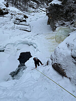 Vel tilbake ved brua tok vi på sele, hjelm og stegjern. Elva Tundre hadde frosset ganske bra til, men enkelte steder var det tynn is man kunne tråkke gjennom, så vær obs. Det er ikke hvert år det er mulig å isvandre opp her, men i år hadde det vært kaldt over lenger tid. Første opptak er 15 meter (WI2+). Deretter vandring et stykke før elva snevrer seg inn ved en stor kulp med overheng. I neste kulp var det åpent vann der vi ikke kom oss forbi. Løste det ved å gå litt tilbake >>>