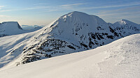 Da det så ut til å bli en nydelig ettermiddag i Bardufoss ble det spontantur. Veivisaren (Jarle Lycke Austbø) var ikke vanskelig å lure med og kort tid etter tjenesteslutt satt vi i bilen mot Litlevoll på nordsida av Maukenmassivet. Målet var Stormauken, en av de nærmeste stortoppene rundt Bardufoss. Parkerte i en liten veilomme og på jordet ovenfor veien var det heldigvis snø slik at vi slapp skibæring. Satte i jevn marsj opp gjennom bjørkeskogen i relativt fast snø. Ovenfor skoggrensa ble det etterhvert ganske så hard skare. Vi fulgte en skråflanke bort til 796-vannet som ikke var noe særlig å gå i på det harde føret. Videre var det kun en bratt bakke opp til toppen. Jeg fant en bar flekk og ventet en liten stund på Jarle som slet litt med å gå på randoskiene i denne delvis isete flanken. Da han skulle >>>