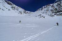 Vi holdt et friskt tempo videre opp forbi vestsiden av Vardafjellet. Her flatet det litt ut i retning toppen på Tylderingen. I grunn en fin plass å snu på akkurat her om man ønsker en fin og skredsikker nedkjøring i lite vindutsatt terreng. Mulig det blir noen hodelyktturer opp hit. Anyways, videre mot Tylderingen trakk vi etter hvert over på vestsiden av ryggen. Mer avblåst her oppe. >>>