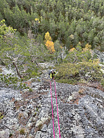 Guidet klatretur med Amy Mir og Huong Le som alternativ for bretur til Rasletinden. Reiste fra Gjendesheim og ned mot Sjoa i håp om å komme unna regnværet i vest. Det klarte vi. Etter informasjon fra Christen Tellefsen fikk jeg tips om at det muligens fantes noe flertaulengders klatring i berget sør for Øykjeholet i Heidalen. Vi parkerte i avkjørsel mot gruva ved Åmotsrønningen og marsjet oppover i bratt granskog. Lette en stund etter innsteg til noe som kunne minne om klatring som ikke var altfor vanskelig. Har få gode oversiktsbilder av klatringen, men man får se på bildene jeg har og GPS-tracket. Merk at antall taulengder sjeldent er lenger enn 30 meter siden dette var guidet klatretur.
