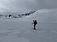 Føringstur for Terje. Gikk med skiene på sekken fra Visdalen og opp mot Skautflye. Byttet til ski fra litt innpå flatene (der vi forlot stien iflg. tracket) og satte kursen sørover mot Veobreahesten. Målet var kun østtoppen på Veobreahesten siden Terje manglet denne. Vi traverserte oss østover i sørflanken i håp om at dette skulle være mest effektivt, men snøen var såpass hard og isete så det ble tausikring og taulengder hele veien fram og tilbake fra toppen. Dette tok litt mer tid enn planlagt, men vi gjennomført trygt og sikkert.