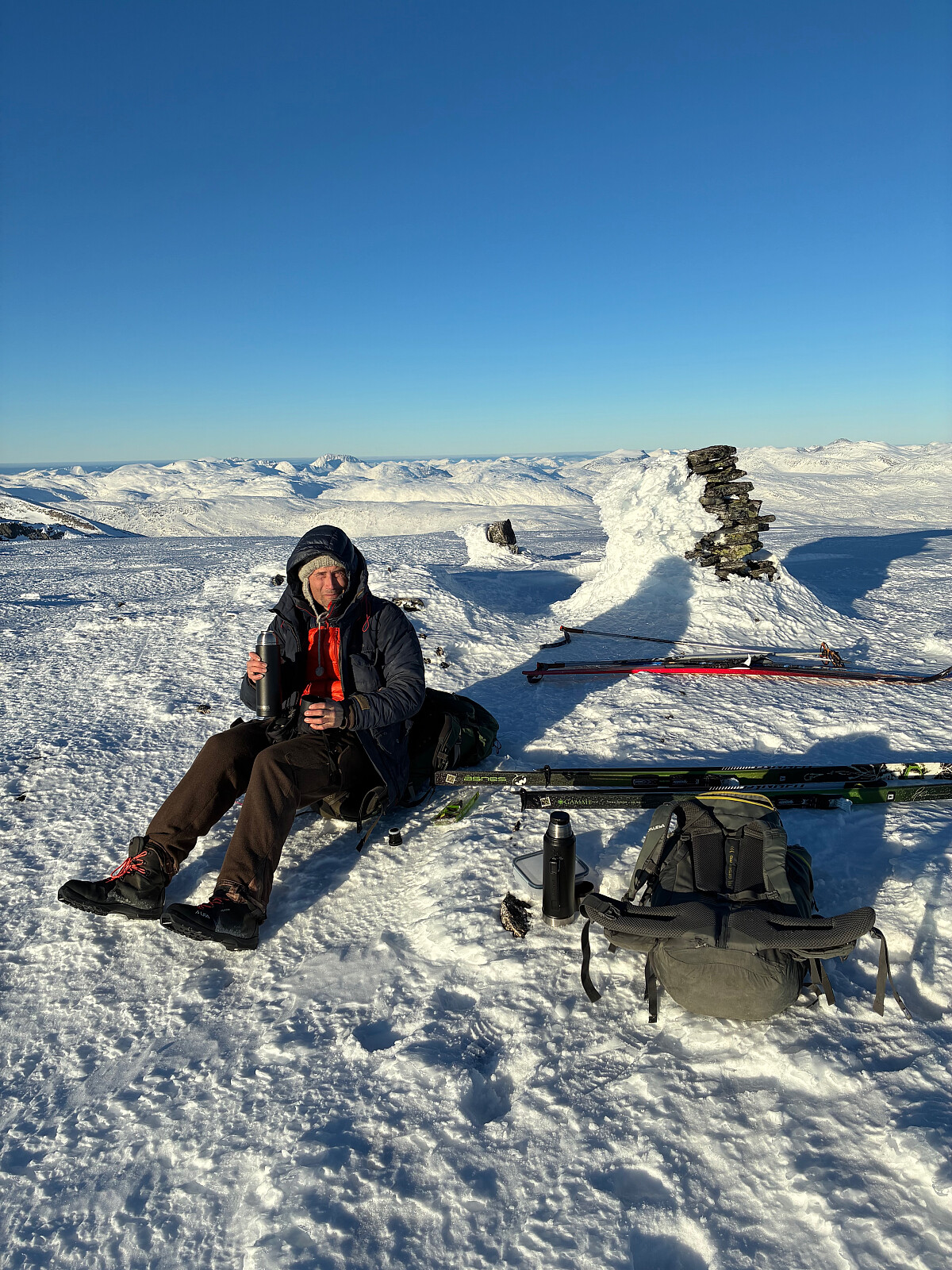 Tur med Øyvind Br. til Sandåtinden. Kjølig dag i slutten av januar. Under -25c ved start på vinterparkeringen sør for Grotli. Fulgte scooterløype opp til Heillstuguvatnet, derfra ut i terrenget. Føret var meget vindpakket og hard. Kunne nesten gått hele turen til fots uten å ha tråkket gjennom snøen. Ikke veldig mye snø i terrenget heller, men søkk og leområder var forholdsvis godt fylt igjen. Bar skiene opp kneika langs nordryggen der man kan se inn mot Sandåbreen. Oppe på platået inn mot toppen var det nokså isete med mye stein som stakk opp. Krevende skiføre, men godt å komme opp i sola. Utsikten var nydelig! Kan faktisk se helt hjem til der jeg bor i Bismo. Returen gikk forsiktig for seg pga det harde føret. Øyvind fikk en liten tur ned på baken, og den kjentes!