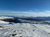 Tur med Øyvind Br. til Sandåtinden. Kjølig dag i slutten av januar. Under -25c ved start på vinterparkeringen sør for Grotli. Fulgte scooterløype opp til Heillstuguvatnet, derfra ut i terrenget. Føret var meget vindpakket og hard. Kunne nesten gått hele turen til fots uten å ha tråkket gjennom snøen. Ikke veldig mye snø i terrenget heller, men søkk og leområder var forholdsvis godt fylt igjen. Bar skiene opp kneika langs nordryggen der man kan se inn mot Sandåbreen. Oppe på platået inn mot toppen var det nokså isete med mye stein som stakk opp. Krevende skiføre, men godt å komme opp i sola. Utsikten var nydelig! Kan faktisk se helt hjem til der jeg bor i Bismo. Returen gikk forsiktig for seg pga det harde føret. Øyvind fikk en liten tur ned på baken, og den kjentes!