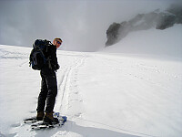 De siste dagene hadde det kommet bortimot 20-50 cm snø i fjellet, men nå skulle visst værgudene være noe mildere med oss. Været var fint oppover bakkene til Leirbrean med blå himmel i vest. Men etter hvert som vi nærmet oss Kalven skyet det til, deretter kom snøen og så tåka. Kladdene på fellene ble større og større, og det var et rent helvete å komme seg opp på Midtre Kalven (2030) denne dagen. Etter hvert fant vi ut at vi måtte holde sammen når sikten >>>