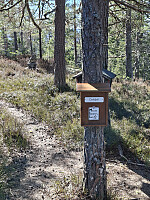 Kjørte Fv416 mot Risør og tok til høyre mot Laget. Til venstre rett etter krysset ligger turparkeringen. Her er det satt opp infoskilt med kart over stier i området. Ved parkeringen er det rester etter en tysk bunkers fra 2.verdenskrig. Parkerte og fulgte skilting mot Gartetjenn. Veien følger Kvernhusbekken oppover til stidele. Tok her til venstre mot Skardalen og Myrtjenna. Etter 300 meter forlot vi stien og gikk i terrenget mot toppen. Selve toppområdet er ganske flatt. Det er foretatt hogst her i vinter så det er litt kronglete å gå fram til der toppunktet skal være. Ingen markert topp og ingen utsikt. Tilbake holdt vi oss utenfor hogstområdet og gikk stort sett i lyng ned til vi møtte stien igjen. Fortsatte mot Gartetjenndammen. Dammen er har ikke vært i bruk siden 1980 tallet >>>