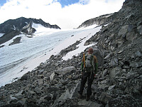 Store planer denne dagen...men vi vet vi som går i bratt lende at ting kan skje. Vi hadde nå planer om å klatre opp nordryggen på Vesttoppen på Styggedalsryggen og gå Skagastølsryggen ut. Det ble det ikke noe av denne dagen. Vi startet i Helgedalen og gikk rimelig hardt oppover mot Gjertvassbreen. Vi brukte vel ca 3 timer ikke langt fra der klatringen skulle starte. Morten kløv først...Øyvind K. bak han og Ole Petter og jeg nedenfor...heldigvis litt nedenfor til venstre. Øyvind K. løsnet en stor stein og den rev han med seg og han skled bratt ned en ca 7 meter. Dette kunne gått MYE verre, men såpass ille gikk det at Morten ringte 113. Øyvind K fikk en skikkelig trøkk. Det ble dramatikk....og luften i ballongen gikk liksom ut av oss alle etter dette. Det var ikke så farlig >>>