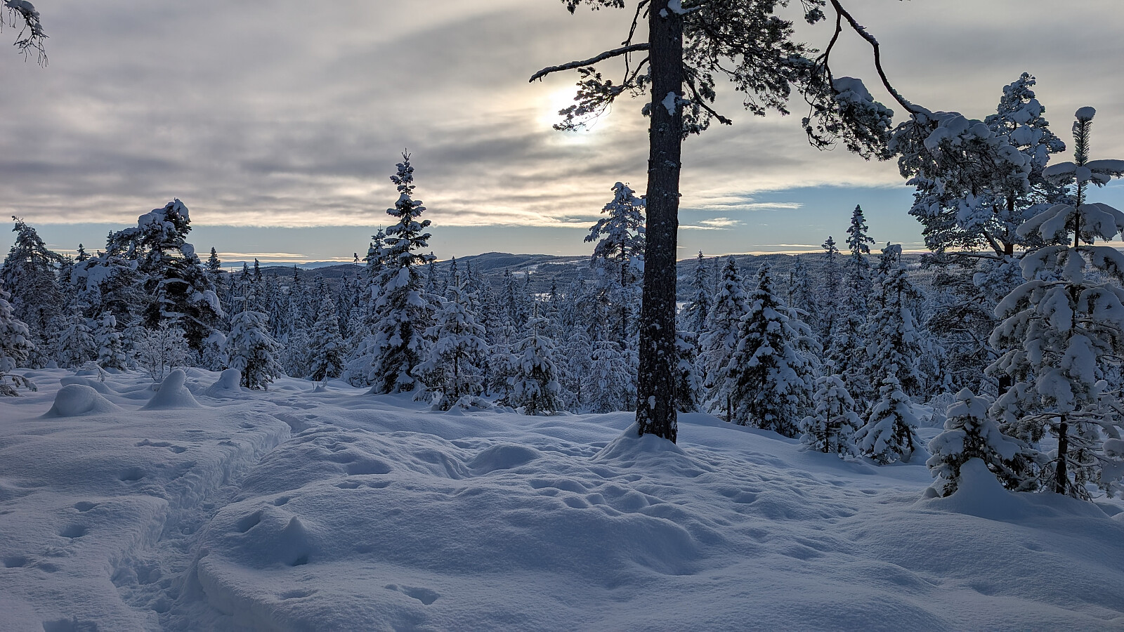 Slang meg med Åskopgjengen sin onsdagstur. Planen deres var å gå fra Herva til Vestre Ormtjern...med en liten mulighet for å gå videre over Høgbrenna. Slik gikk det ikke pga tunge forhold. Etter bålpause ved vatnet ville de andre gå samme vei tilbake. Jeg ville prøve å ta runden alene. Det ble en tøff tur for meg og Embla i snødybder fra 50...70 cm. Embla ble tidvis nærmest borte i puddersnøen. I bratta opp mot Høgbrenna sleit jeg godt, men med bruk av hele kroppen nå karret jeg meg opp til toppen. Heftig! Så...dukket solen så vidt fram og skapte nettopp det lyset jeg håpet på. Flatt terreng videre nordover nå, men dyp snø. En bra treningsøkt ble det...og Embla måtte kjempe idag. Litt kjipt da alle de andre allerede var hjemme i sine hus...så måtte jeg traske 6km på >>>