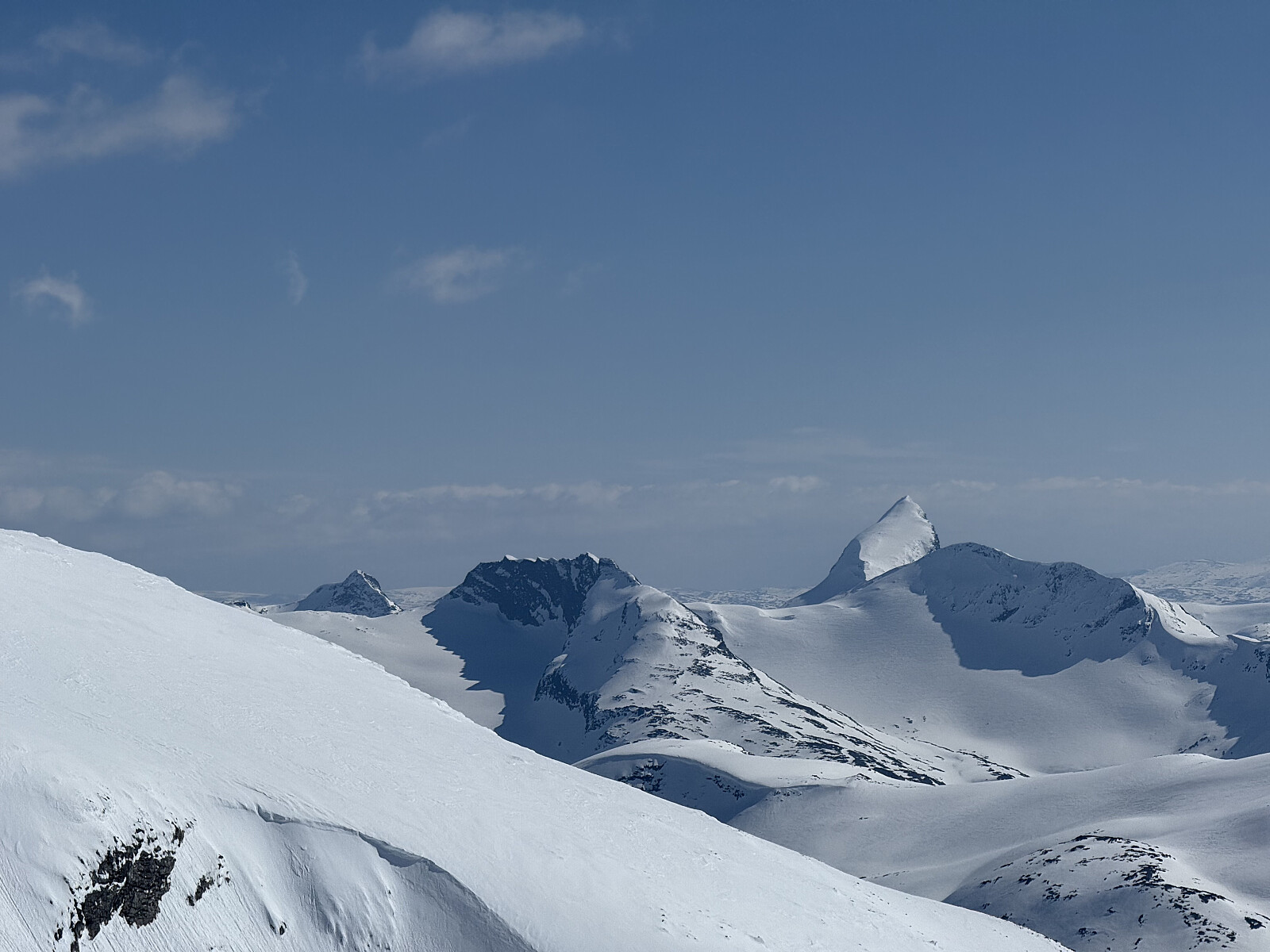 Startet fra familiehytta i Heidal i 0700 tiden og la avgårde fra Krossbu 0830. Fikk svettet fra meg oppover lia og ankom foten av Kniven etter ca 1,5 time. På med stegjern og frem med isøks var det bare å gyve løs på dagens første topp. Prøvde meg på en spansk en med å ta meg opp på Sauen fra nordsiden. Det gikk forsåvidt fint, men var såpass bratt at det fristet mer å gå rundt ned igjen. Videre bort til foten av Sokse og ny runde med stegjern og isøks. Fantastiske forhold denne dagen, med "E6" stier, stuegulv på toppene og stort sett vindstille. Videre opp på Veslebjørn Nord før en kort aketur før den lengre oppstigningen til Storebjørn. Videre opp på Veslebjørn og dagens høydepunkt med eggen bortover >>>