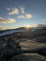 Kjørte opp til kaféen på Valdresflye fredag kveld og la meg i teltet et par hundre meter fra veien. Stod opp tidlig, heiv innpå litt kaffe, egg & bacon før jeg satte meg på sykkelen og trilla ned til Bygdin. Optimalt skulle jeg sovet på Torfinnsbu, men siste båt inn fredag gikk for tidlig og første båt inn lørdag går "for seint", men lite å gjøre med det.