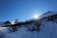 Veret skifter jammen fort... Ifrå vinteridyll nede i skogen til aukande sterk kuling i kveldsmørket på toppen! Trur kanskje dette var ein av dei friskaste turar, der ein lyt revurdere ruta. Fordi ein ser omtrent ingenting. Godt ein kan kjenne igjen nokre merke steinar! Mykje nysnø som blir flytta på ein rimelig heftig og effektivt måte! Noko som igjen fører til obs. neste turdag. Vind ifrå sør/aust. Fantastiske forhold vart det lengre nede i skogen, berre til ei opplysning :)