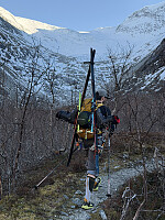 Vi var fem karer i gruppa, og siden vi skulle reise fra ulike steder i landet, ble starten fra Skålatårnet parkering ganske sen. Klokken 18:30 var skiene festet på sekkene, og gjengen var klar for kveldsturen opp Norges lengste motbakke. Høydemeterne forsvant raskt på tørr og fin sti oppover lia, og da vi passerte elva Fosdøla, nærmet vi oss snøgrensa og fylte flaskene. Rundt 700 moh spente vi på oss skiene og fortsatte oppover i en vakker solnedgang som farget himmelen blodrød.