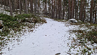 Snøbyger i dag. Litt snø på traktorveg/sti. Gikk greitt å komme opp siste bratta utan snøkjetting. Kram snø ca. 2 cm. med godt feste.