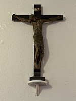 Den nye arbeidskirken er i tegl og har 250 plasser. Den gamle Kristus-figuren står nå bak alteret i et nytt krusifiks laget hos gullsmed David-Andersen. Glassmaleri >>>