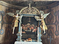 Inngangsportalen til kirkerommet fra våpenhuset består av et to etasjers høyt utskåret relieff i tre med ornamenter.