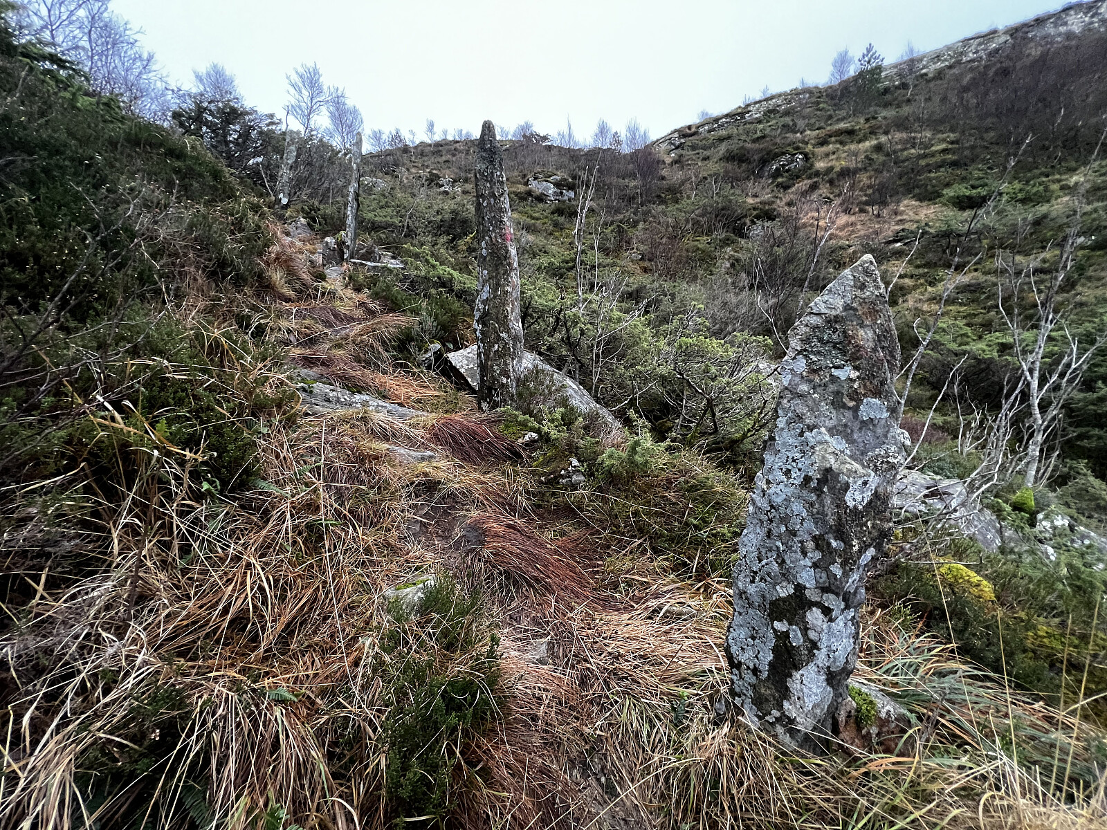 Stor og fin varde her oppe. Toppunktet like bak. La merke til noe merking og en sti på tvers her oppe, men vi fant aldri ut hvor denne gikk. Fulgte samme rute ned igjen til bilen.