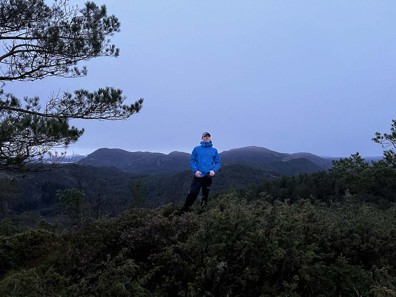 Etter turen på Lifjellet kjørte vi til Ånneland hvor vi parkerte i en tilrettelagt lomme for turen til Midtbøfjellet, som er det høyeste punktet på Sandøyna. Her var det plass til rundt tre biler og skilt med info om turen. I tillegg var det selvsagt god sti til toppen. Det var anslått en tidsbruk tur/retur på 1,5 timer. Dette skulle vi klare på 30 min, mente jeg. Vi startet i moderat tempo og ankom toppen etter rundt 15 minutter. Litt regn og surt vær her oppe. Startet nesten umiddelbart på returen. Ankom bilen etter 29 min. Litt konkurransepreget, selvsagt, men jeg løp aldri et eneste steg. Ville bare vise at jeg hadde rett i at det ville ta oss 30 min på turen.