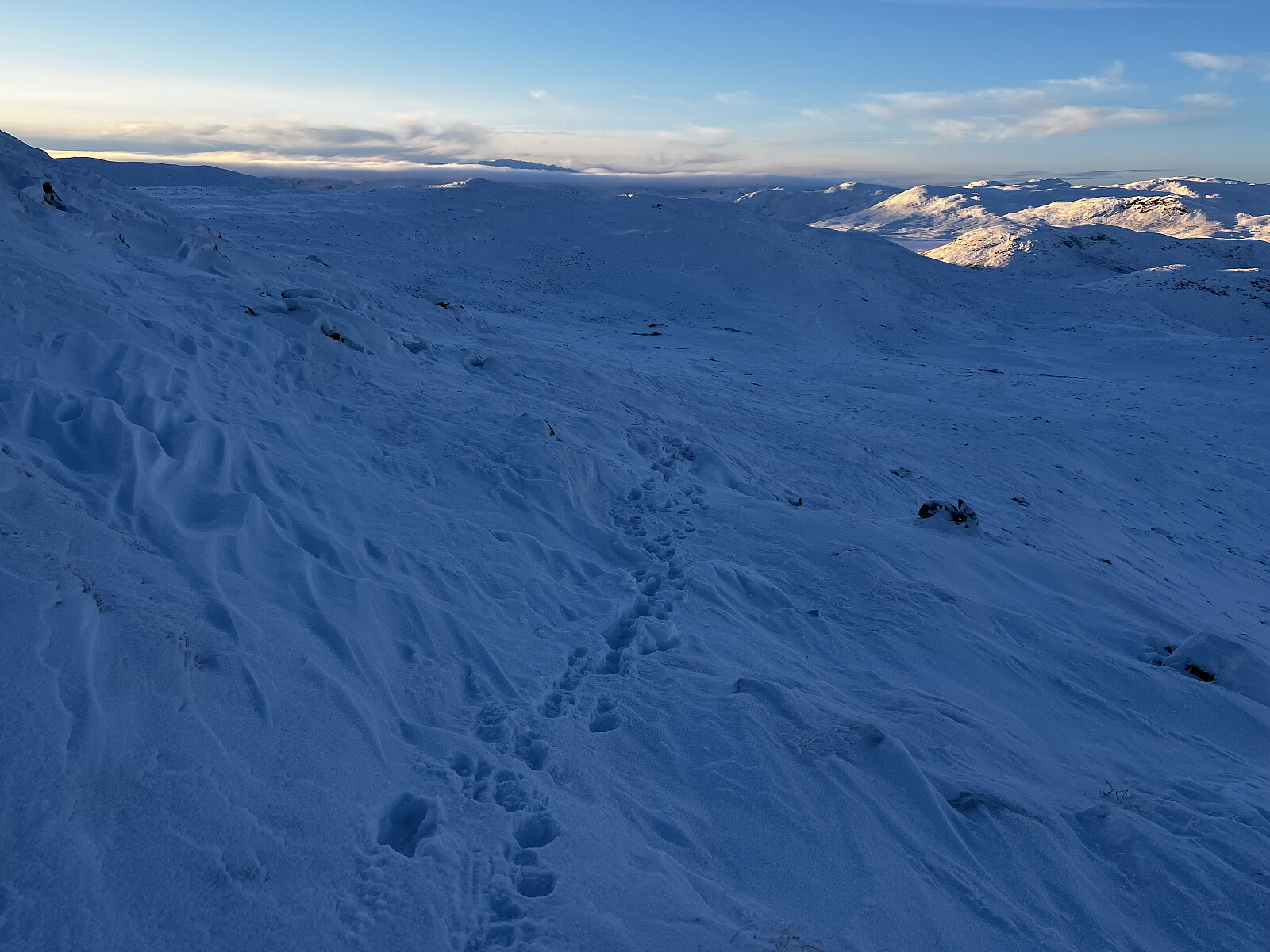 I enkelte leområder sank vi ned til låret. Det var gledelig å se at alle vann var helt islagt og nedsnødd og at temperaturen i høyden var såpass lav. Mye tyder på at det blir en bedre vinter i år enn i fjor. Håper da for guds skyld det!