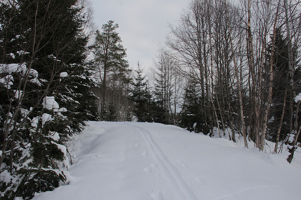 Planen var å gå opp rett øst for Telstad. Der var det tømmerdrift på vegen, så jeg fortsatte til neste mulighet, ved Pellan. Her var det en fin parkeringsmulighet, og et skispor oppover den ellers urørte vegen. Antydning til mildværskorpe nederst, tørrere og mer snø høyere opp. I skogrensa blei jeg "pressa" østover av skrenter og bratt terreng. Dermed blei det en transportetappe fra Gråberga og bort til toppen. Støkte en del storfugl, og det var mye elgspor i terrenget. Jammen fikk jeg se skogens konge også.