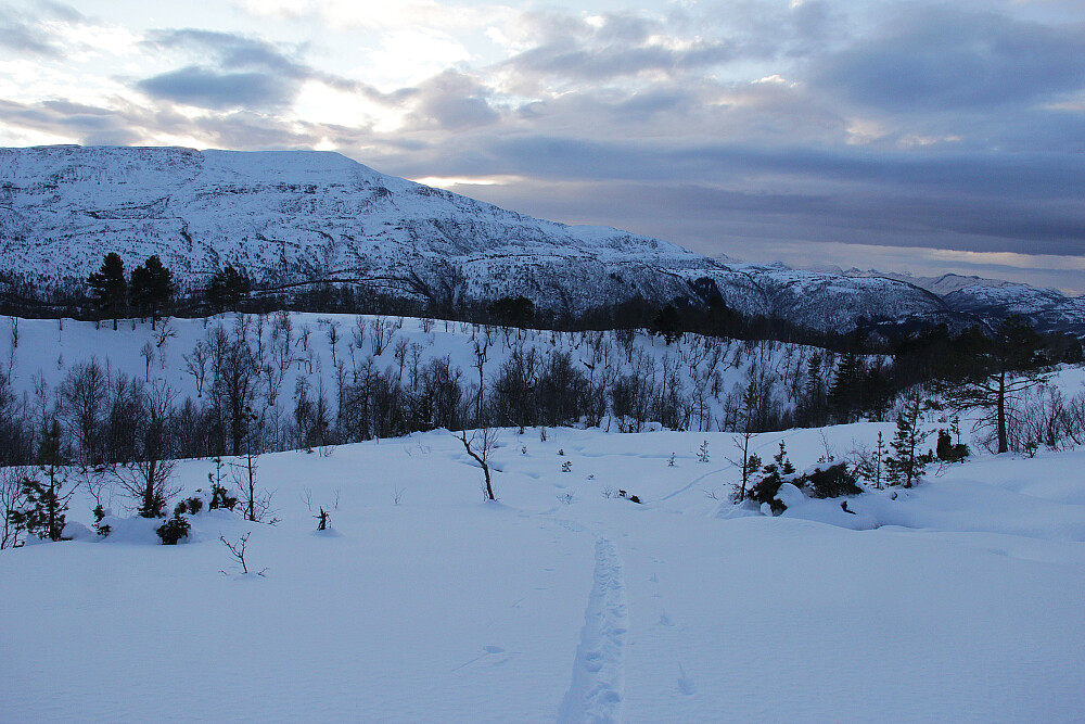 Fant det best å returnere samme veg. Det går sikkert an å finne kortere ruter, men hadde ikke lyst å rote meg bort i noe ugreit terreng. Vinden hadde pakka snøen litt oppå fjellet, men fra kanten av Gråberga og ned var det nydelig føre. Bortsett fra opp et par kneiker, gikk det radig ned igjen.
