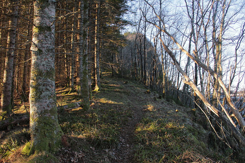 Etter turen til Hjørungneshornet dro jeg videre til Engeskaret. Parkerte på innsida av tunellen. og gikk opp i skaret, der jeg møtte sola. Veldig fin start gjennom skogen langs ryggen mot Ulsettua. Over barskogen gikk det raskt over til åpen bjørkeskog. Her var terrenget mer tuete, og stien gradvis fylt av mer snø og is mot toppen. Så ut til å være enda mer snø mot Litletua. Tok litt mat og returnerte samme veg.