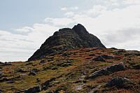 Overnatta i telt på Urke camping, og dermed lå det til rette for tidlig start fra vegen i Langsæterdalen. Etter anmarsj inn dalen tok jeg opp sørryggen. Et markert svacrux var spennende nok, ellers et par andre luftige, men enklere passasjer mot toppen. Etter en matbit ved varden fortsatte jeg langs ryggen østover mot Geitskaret. En ørn seilte under meg og utover dalen. På sørryggen skremte jeg forresten opp et par ryper. De var godt synlig, da vinterdrakta allerede var på vei. Er ikke det tidlig? Greit over "svataket". Deretter blei jeg pressa ned i fjellsida av tverrgående hamre. Ikke lett å se spor etter tidligere ferdsel i form av tråkk, varding eller lignende her. Hadde så vidt gløtta på noen tidligere rapporter, ellers blei det å lese terrenget best mulig bortover. >>>