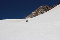 Etter å ha forsert brefallet, delvis til fots, kom vi opp i sola. Vi fant det best å prioritere, det kom hostekuler med jamne mellomrom, og kroppen ville fortsatt helst ha sneglefart. Vi droppa derfor Hinter Fiescherhorn, men hadde tanker om at det gikk an å runde Gross Fiescherhorn på nordsida og deretter bestige toppen langs nordvestryggen (snøegg). Vi ville dermed slippe omvegen ned den vanlige ruta fra Fieschersattel til Ewigschneefeld, >>>