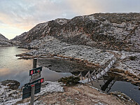 Startet tidlig fra hytta for prøve å fullføre dagens plan før det ble mørkt. Dessverre går det ikke ferge tidligere enn 07:00 fra Gjermundshavn om lørdagene, så jeg kom meg ikke til Langfoss før kl 0850. Bar utstyr ned til kaien nedenfor parkeringen og fikk raskt blåst opp pack raften. Padlet ut på fjorden rett over kl 09:00. Flott vær, tilnærmet vindstille og det tok kun 15 minutter over til Ytre Mosnes. Fikk lov å legge pack raften på kaien og la i vei opp langs elven. En svak, men grei sti ledet meg opp til hengebrua over Mosneseelva.