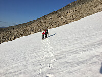 Først 1300 meter på vei, før vi svingte opp bratte skråningen mot breen, ca. 350 høydemeter, inn i tau, myk bre, ikke frosset i natt, stegjern likevel til den bratteste siste delen, før innsteget. 150 nye høydemeter >>>