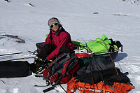 Ca. klokken 12.00 er vi oppe i Veoskard. Det er en dryg bakke, og fellene sitter ikke godt nok til å forsere hele bakken med skiene på bena. Ihvertfall ikke halv-fellene. Ved rundt 1750-1850 moh. tar vi skiene på sekken, og går i tidligere spor, opp det bratteste partiet. Vel oppe i skaret har vi allerede flott utsikt mot mange nye tinder og Veobrean. I tillegg har vi flott utsikt mot gårsdagens område; Hellstugutindane.