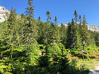Herfra 300 høydemeter opp på fin sti. Vel oppe ved lite vann, ca. 1200 moh. Det var 28 grader på start så svetten rant godt selv om vi gikk nesten nakne. Vel oppe er det bare å ta for seg i det nydelig duvende turterrenget, med diverse skrenter og idylliske vann. Vi valgte en slags 8-tallsform og var innom to kommunetopper og et par andre litt høye knauser.