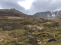 Svært bratt rygg, med snøbre i renne opp øst for toppen. Noe krevende rutevalg.Med Rusla.