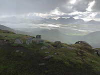 Fin sti så og si hele veien. Men ikke de siste 150 meterne. Tåka ble rimelig kjip etter hvert som jeg nærmet meg toppen. Da jeg endelig nådde varden og en påla med et rør på, trodde jeg det var i boks. Men så i et kort øyeblikk med bedre sikt ser jeg til min forskrekkelse at toppen egentlig er en steinblokk, litt lengre ute. Jaja, sånn går det når planleggingen er for dårlig. Opp skulle jeg uansett!