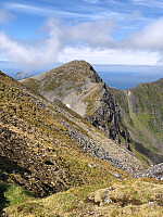 Over bjørkeskogen er det grønt og frodig, med flotte bratte fjell hele veien. Lunt og godt i le for dagens relativ sterke vind. Valgte litt stødig ur opp flanken av fjellet fremfor myk mose. Fant en gress-renne som ikke så så altfor bratt ut, og her var det tydelig at andre hadde gått før meg. Vel oppe på ryggen helt fantastisk utsikt alle veier, og en lett og passe luftig spasertur bort til toppen.