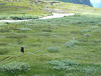 For et vær og for en vakker dal. Vi labber avgårde etter nydelig frokost på den stilige og trivelig betjente Sognefjellshytta. Turen til Skogadalsbøen skal ta ca. 4-5 timer og vi har all verdens tid. Vi nyter utsikten og koser oss i varmt sommervær. Turen er for det meste slakt nedover, ca. 650 høydemeter ned, noen få meter opp, 14 km. Skogadalsbøen skuffer heller ikke. Med ungt og uredd vertskap, som håndterer matlaging, baby, luftambulanse, skadde folk, hund som spiser lemmen og dør på gårdsplassen og mye mer på strak arm. Imponerende.