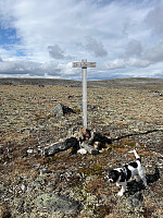 Deretter opp på ryggen til rødmerket tråkk til toppen. Mye større varde her enn på Bellingan. Synd med utsikten som jeg fikk kun et kort 15 sek glimt av på toppen.