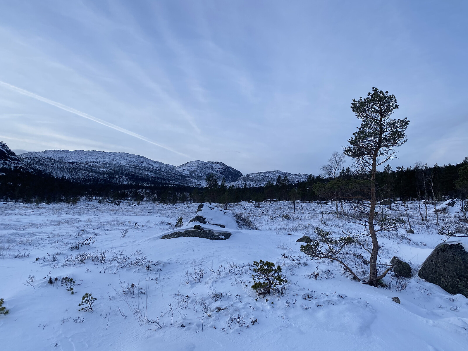 Me fekk ein flott tur på isen langs vasskanten og vidare oppover Tysdalsheia. Her var det ganske bra skiføre – sjølvsagt på dei frosne myrene – men óg over lyngtuer og einerkratt var det godt med skia til hjelp. Det var ein god del dyrespor, i alle fall av hjort og truleg rådyr, og både urin og skit av ein retteleg >>>