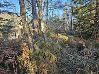 Etter turen til Orrtua kjørte jeg et lite stykke nedover fra Bontveit og parkerte ved en skogsvei. Hadde planlagt en rundtur på skogsvei på østsiden av Ulvsfjellet samt å besøke hytten Fjellro som tidligere var bedriftshytten til trelastfirmaet Namtvedt, nå privat. Oppe ved hytten var skogsveien blokkert av store graner som var rotvelt etter stormen. Jeg valgte da å gå forbi hytten og ned en gjengrodd vei på østsiden. Derfra tilbake på skogsveien jeg gikk opp.