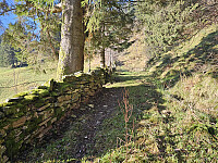 Tur fra Haukeland i Arnadalen til Erdalsvarden. Parkerte i en større møte lomme nedenfor Brattland gård. Gikk opp i tunet til gården der jeg tok inn postvei traseen Oslo - Bergen. Veien er bevart mellom Erdal og Haugo. Jeg fulgte postveien til Grytebakkbrua. Passerte flere rotvelt som var ryddet, men rett etter Grytebakkbrua var veien helt blokkert av store graner etter stormen Amy.