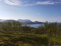 Vi slappet av på Malangen Apartment på formiddagen fordi været skulle bedres ut over dagen. Omkring halv to kjørte vi avgårde for å gå på tur. Vi fikk litt regn på bilturen, og da vi gikk fra parkeringsplassen var det litt tåke på toppen av Store Bentsjordtinden. De første 300 høydemeterne gikk i skogen. Det var veldig bratt, ikke så rart siden distansen var på 0,7 km. Det var også en del slitsomme mygg i skogen, men myggsprayen hjalp. Det var kjekt å ha sti å følge i skogen, men da vi kom høyere var det ikke noe godt etablert sti. Det gjorde ingenting fordi terrenget var fint å gå i. Til tider noe bratt, men flott utsikt og fine omgivelser. Vi hadde ingen tåke på toppunktet i dag. Nedturen gikk også effektivt med en del snørenner. Det ble også litt akrobatikk før >>>