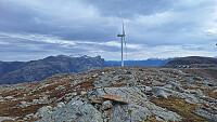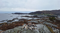 Mye høy lyng opp gjennom skogen, så greit med sti selv om den etter hvert ble temmelig gjengrodd og vanskelig å følge. Det er langt mellom merkepinnene, og hjorten har lagd stier overalt, så det er fort gjort å gå feil. Lagde meg en rundtur. En del snø i skyggesidene, og snøen var lumsk siden den er fra mars og ikke bærer. Men haren hoppet lett over og fulgte meg oppover mot første toppunktet. Der står skiltet mens høyeste ligger på kanten mot Skarvatnet.