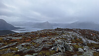 Mye nedbør i løpet av natta, og over ca. 300 moh. kom den som snø. Litt høyere snøgrense i ytre strøk, og det var svært vått, sleipt og glatte sva i dag. Ti grader kjøligere enn i går, men lite vind. Været ble mye bedre i løpet av turen, og jeg slapp etter hvert å gå på GPS.