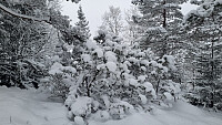 I snøværet tråkket vi oss opp til Blåfjell. Fyra i ovnen og stekte lapper på ovnen. Kosa oss i lenge i hytten her oppe i dag. Nydelig i skogen med alle trærne med snø på. Berit og Jan var med.