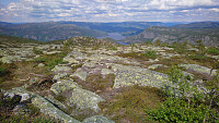 Vi valgte å gå opp den bratteste ruten og gikk derfor langs riksveien ca 200 mot sør til stistart. Gå rett opp og forbi en rød hytte og følg stien videre oppover den bratte stien. Noen steder går den rett opp på svabergene. Noen steder er der lagt ut tau. På toppen av det bratteste partiet flater det litt ut og stien går fint oppover til toppen. Fin matpause på toppen ved varden. Vi hadde så fin flyt at vi glemte å snu oss for å ta bilde av de bratte svabergene som vises bla. på infoen fra Fyresdal kommune. Dumt for det hadde blitt fine bilder med flott utsikt over vannet >>>