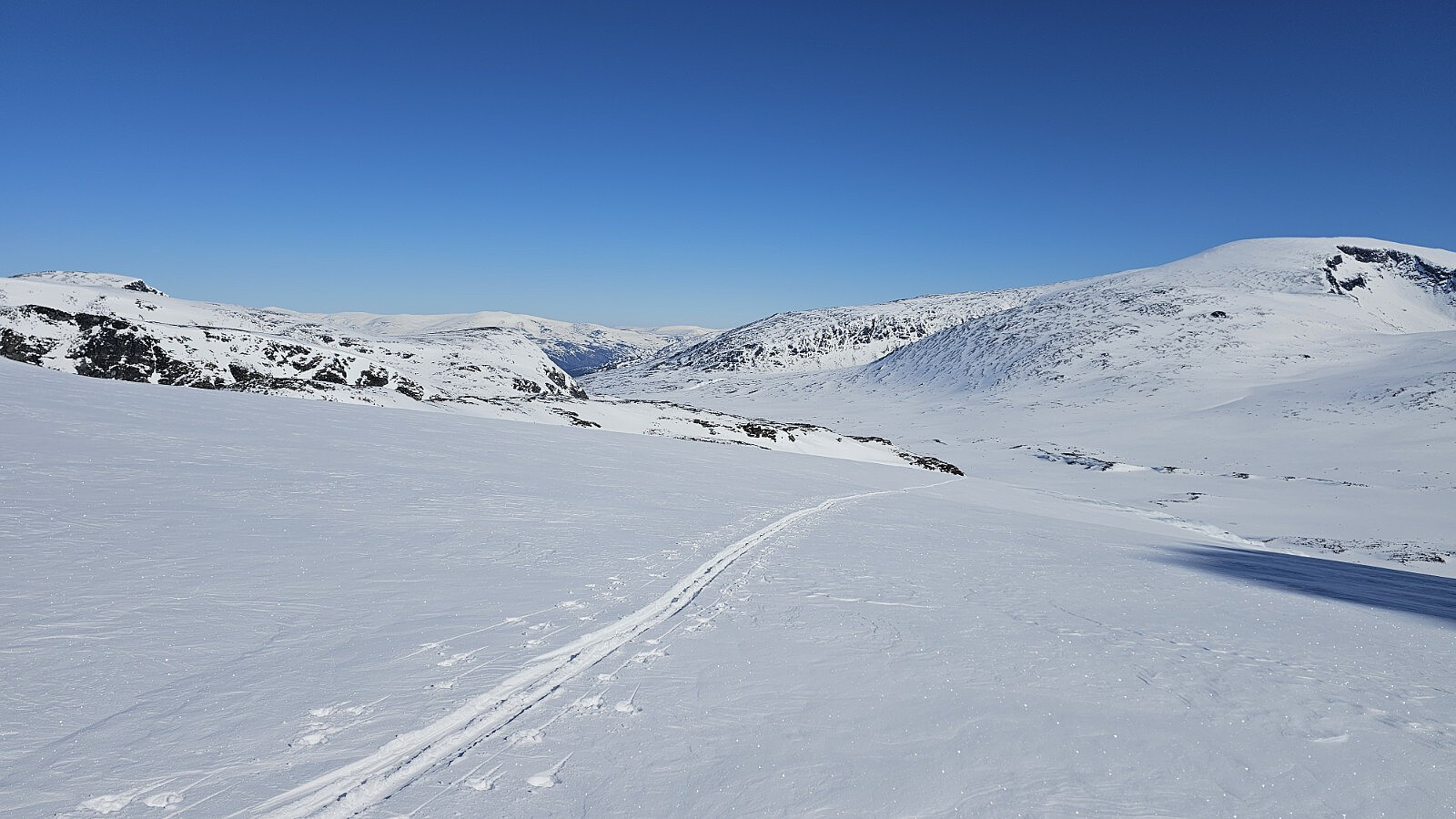 I dag ble det langtur. Vi reiste fra Lemonsjøen kl 05:00 for å treffe Morten, Lars og Øyvind for en tur opp på Memurutinden. JHA og jeg startet litt før de andre men ble tatt igjen i det vi kom opp på snøføre. Deretter ble det en hard tur opp i fjellet. Dette fordi jeg hadde fått beskjed om å stille med fjellski, men det viste seg raskt at min definisjon av fjellski ikke holder mål mot dagnes utstyr. Jeg gikk på mine gamle Madshus Glittertind smørefrie fjellski, med gamle hel feller som kladdet verre. De andre stilte med brede karving fjellski med solide bindinger og halv feller. Jeg bestemte meg imidlertid for å bite med fast og fullføre, selv om jeg sinket de andre betraktelig. De var heldigvis greie og ventet på meg