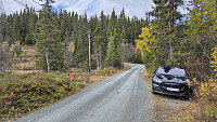 Bråbestemte meg etter frokost, og dro på tur da det ikke var så mange andre planer for dagen. Været var helt greit. Litt utrygt for byger var det, men små sjanser i området jeg valgte å dra til. I Busnesgrenda svingte jeg av fylkesvei 37, og kjørte oppover Kvamslivegen. Denne veien har automatisk bomstasjon hvor man f.eks. betaler på Youpark etterpå. Personbil kostet kr 80,00. Kvamslivegen var bare i OK stand, vil jeg si. I noen av svingene høyere oppe var den litt vannskadet, og noe ujevn. Gjaldt bare å holde farten nede. Rett før brua over Raunebekken var det en stor parkeringslomme med plass til flere biler. Det passet jo utmerket med tanke på at det der i følge kartet skulle gå en traktorvei oppover i retning Adamshøgda ... Men den traktorveien var nå i ferd med å viskes >>>