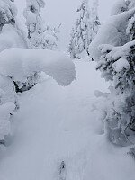 Det var tungt i pudderet opp på den lille knatten rett ved parkeringa (Tverrberget), hvor jeg ofte legger turen innledningsvis, for å sjekke snøforholdene. Snøen lå tjukk på de nedtyngede grantrærne her: